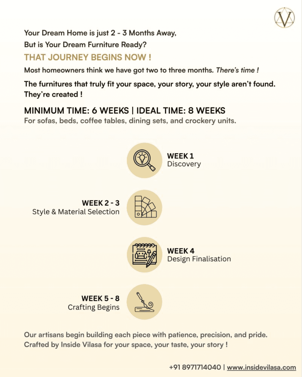Mass-produced furniture may look appealing in a catalogue, but it rarely feels like it belongs in your home. Standard sizes often don’t fit perfectly, finishes may clash with your interiors, and uniqueness is lost in repetitive designs. At Inside Vilasa, we believe true luxury is personal. That’s why, alongside our ready-to-deliver pieces, we specialize in custom furniture, crafted to reflect your taste, fit your space and bring individuality back into your home.