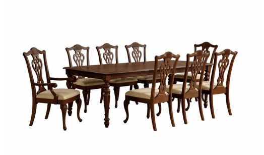 Intricately carved woodwork and tall chairs define this formal set. Perfect for stately spaces and lavish hosting.