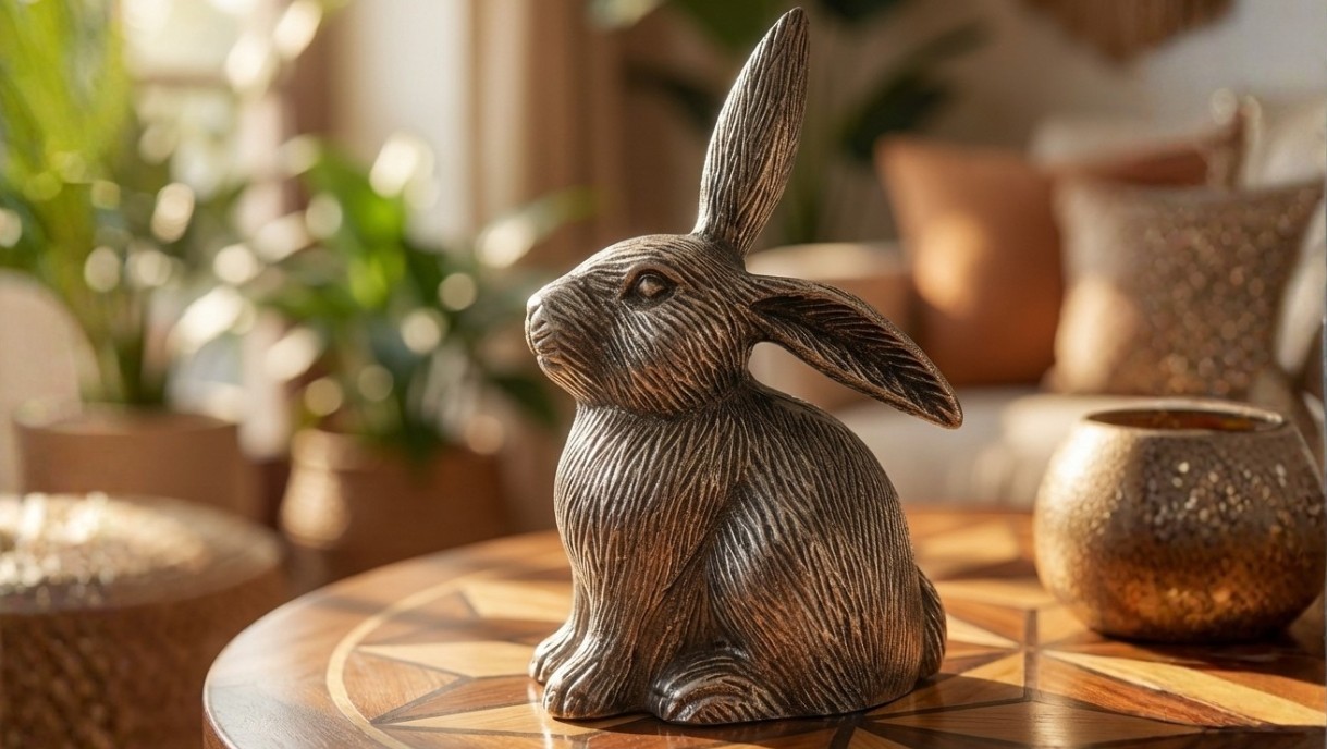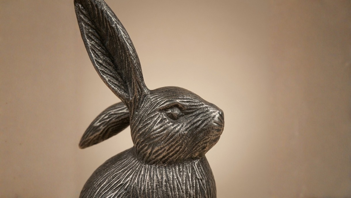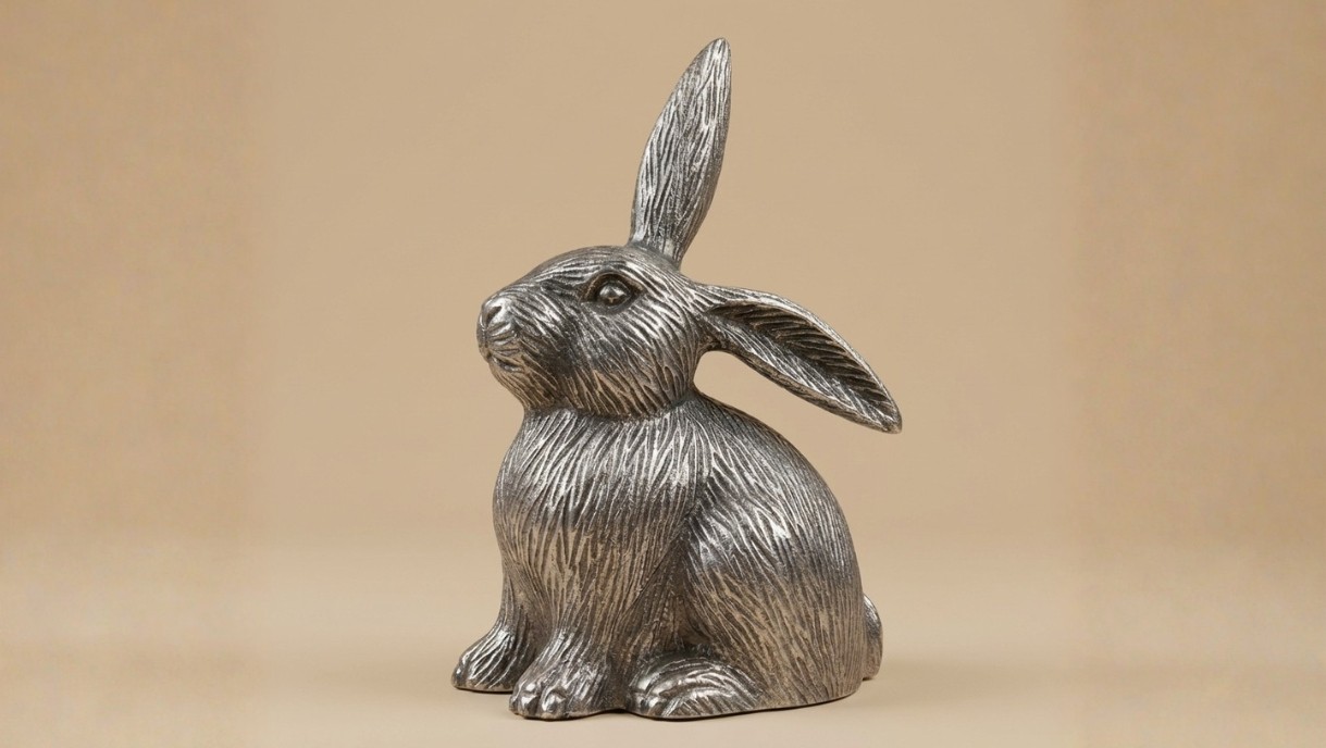 This sculptural rabbit accent is finished in a warm antique gold tone, with finely etched detailing that highlights its graceful form. Both playful and refined, it adds a touch of character and curated luxury to contemporary interiors.