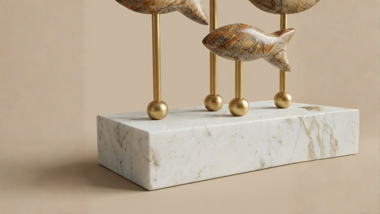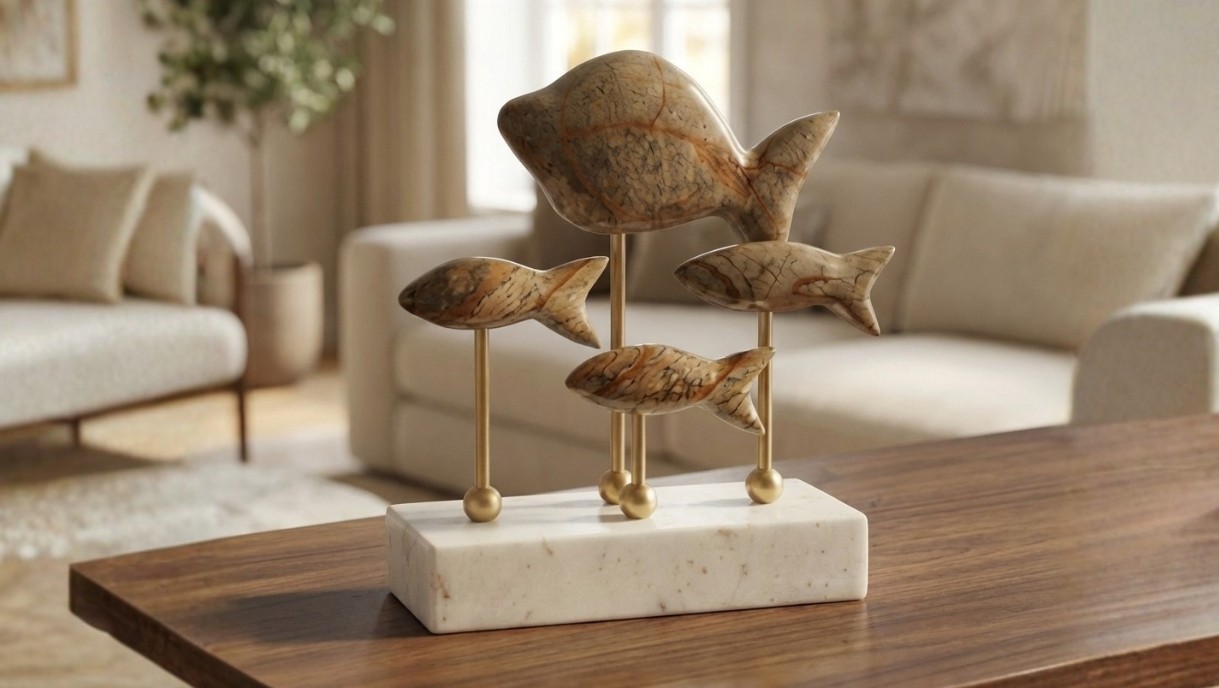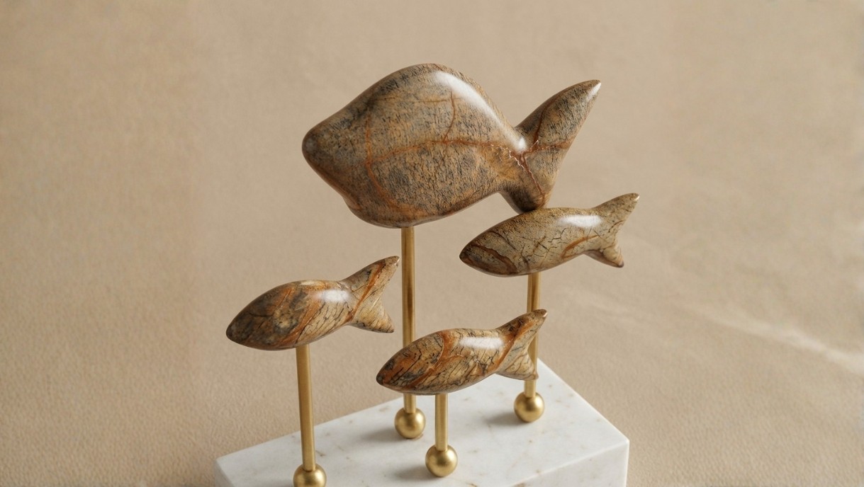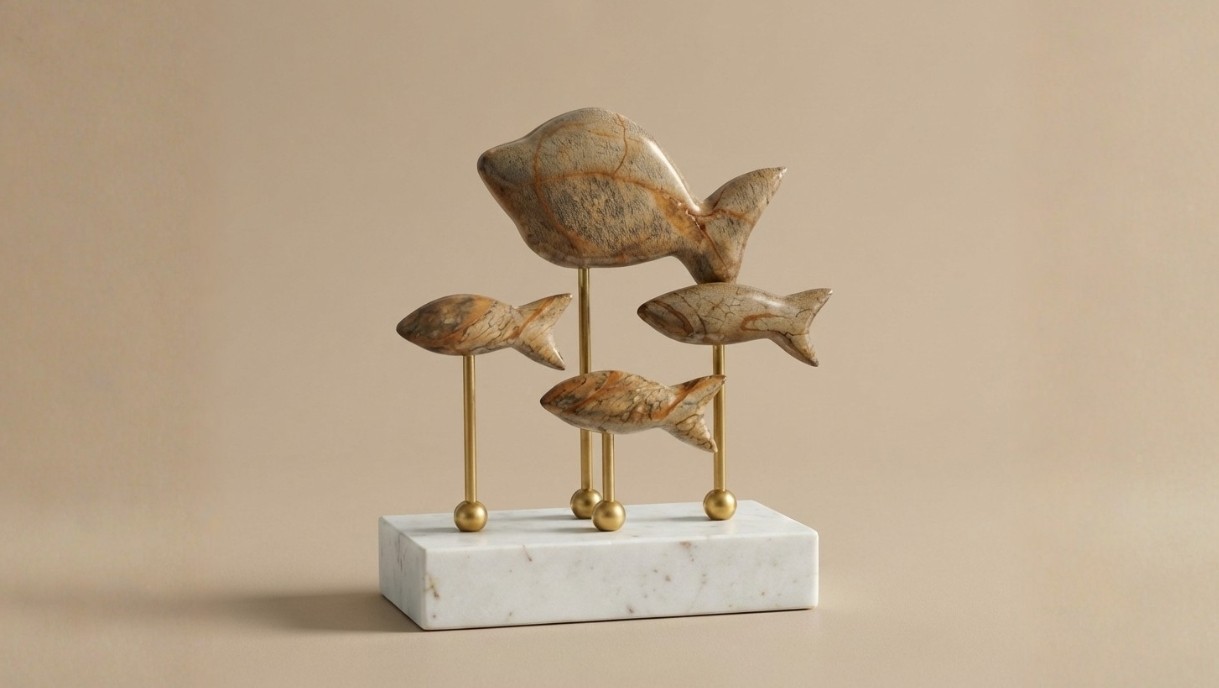 This fossil fish décor sculpture showcases elegant stone-textured fish mounted on sleek gold stems with a marble base, inspired by oceanic fossils and natural artistry. Ideal for modern and luxury interiors, it adds a sophisticated coastal accent to consoles, shelves, and office spaces.