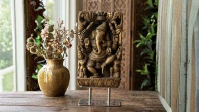 This intricately carved Ganesha sculpture reflects traditional artistry, with rich detailing that conveys wisdom, protection, and auspicious energy. Finished in an antique tone, it serves as a timeless spiritual accent for refined interiors and sacred spaces.