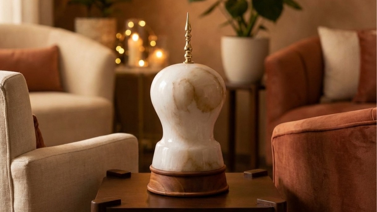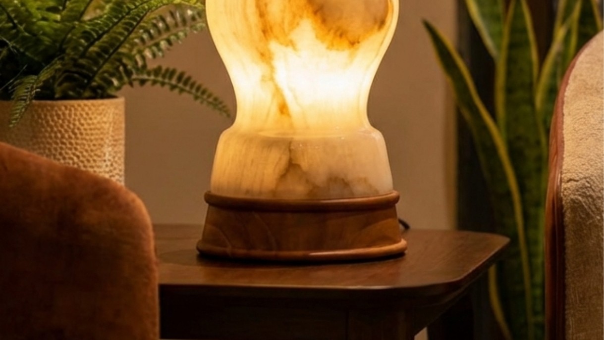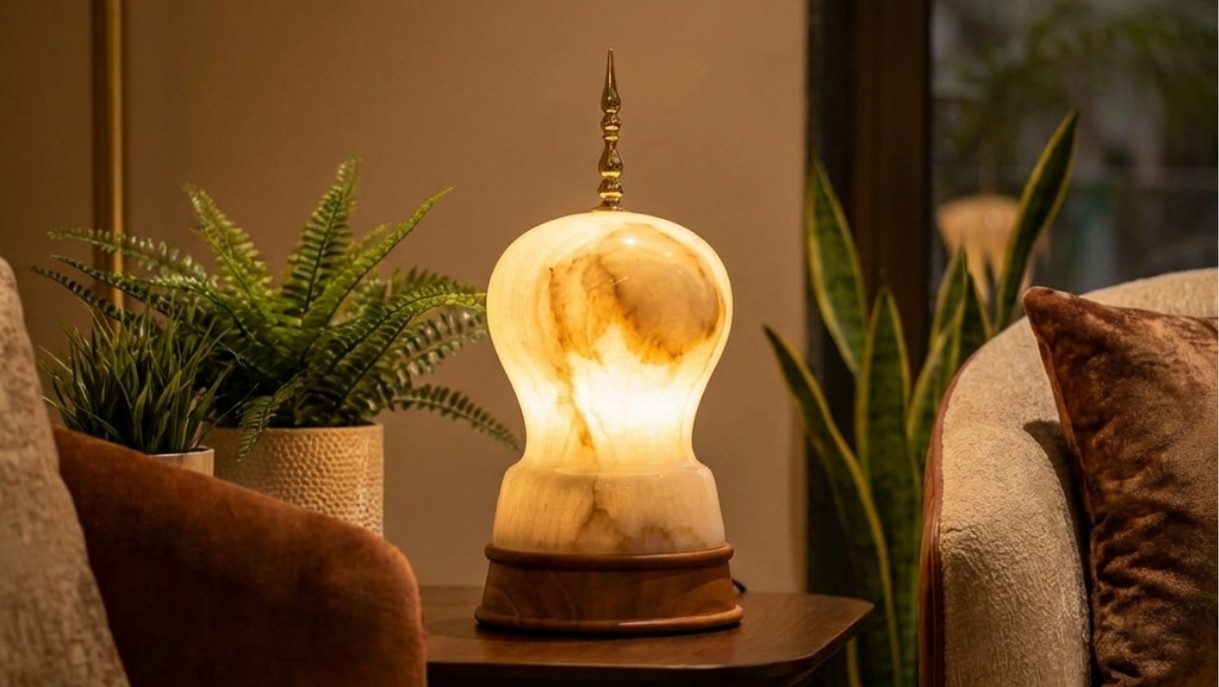 Konark Lamp is a luxury decorative table lamp crafted with a sculpted marble body and a warm ambient glow. Designed to elevate modern and classic interiors, it adds elegance, soft lighting, and timeless charm to living rooms, bedrooms, and premium home decor spaces.