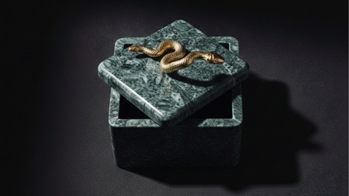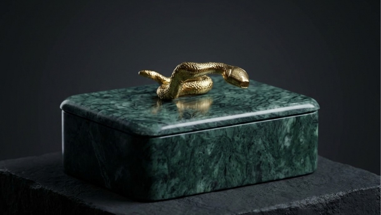 Leticia green Box is a luxury decorative storage box crafted from rich red marble with a striking brass snake handle accent. Perfect for modern and artistic interiors, it adds bold elegance, functionality, and statement style to coffee tables, consoles, and premium home decor spaces.