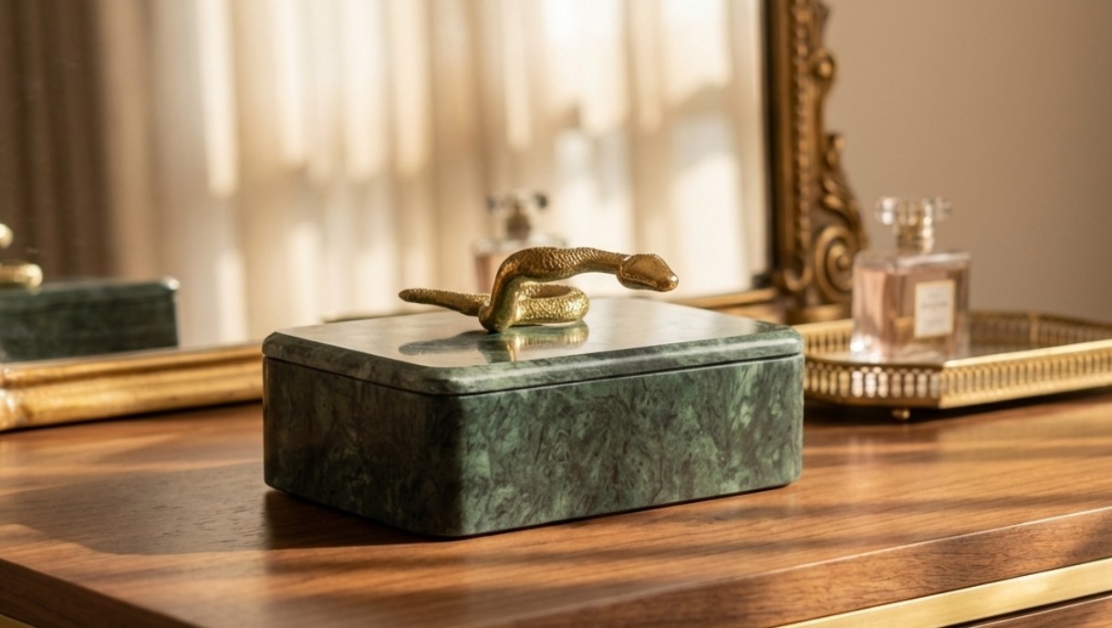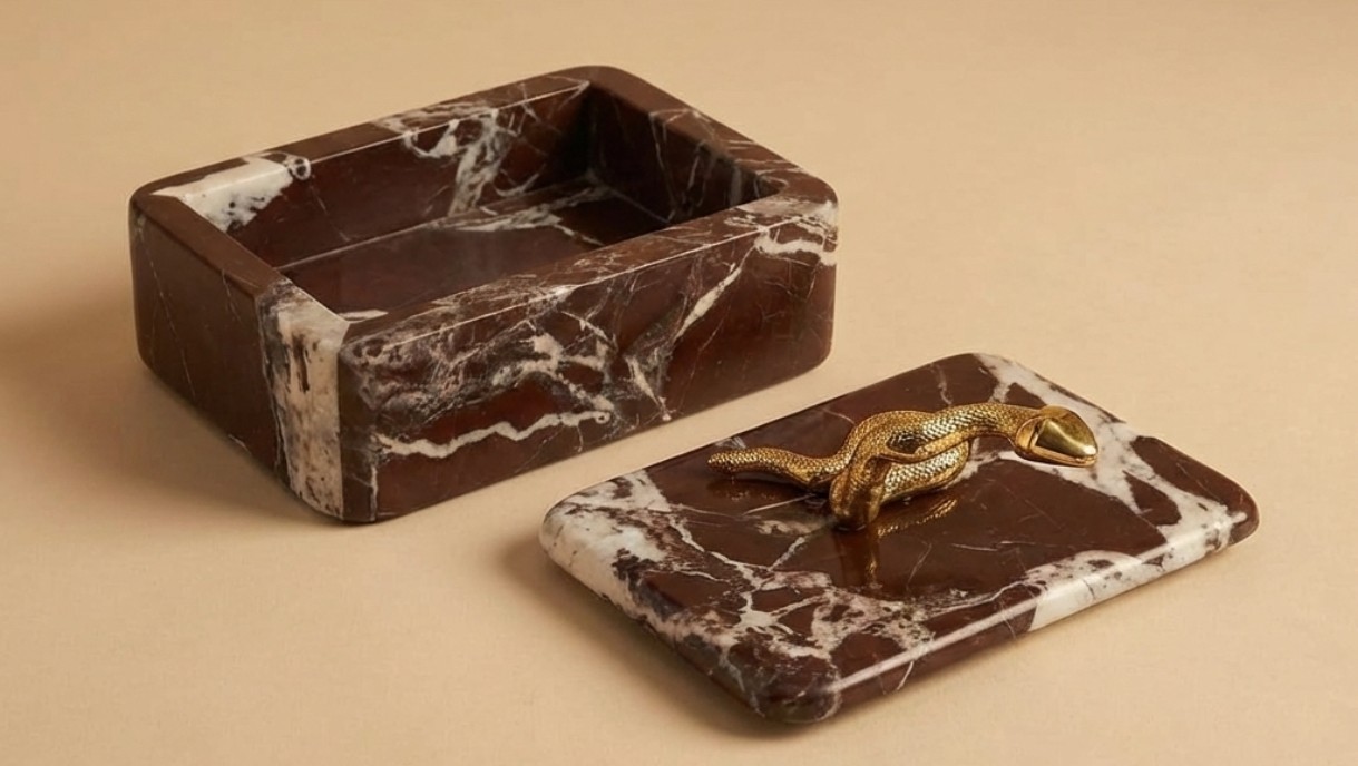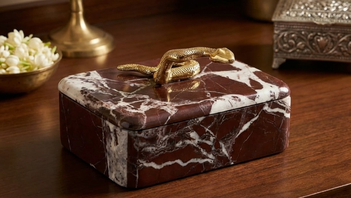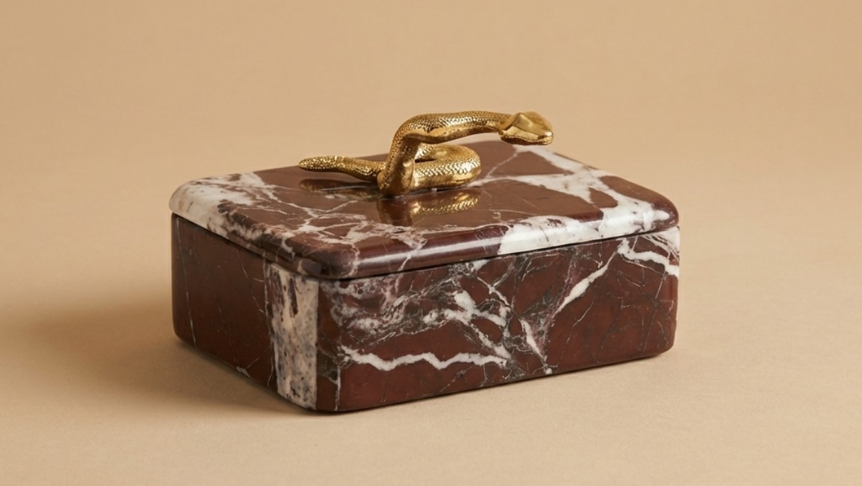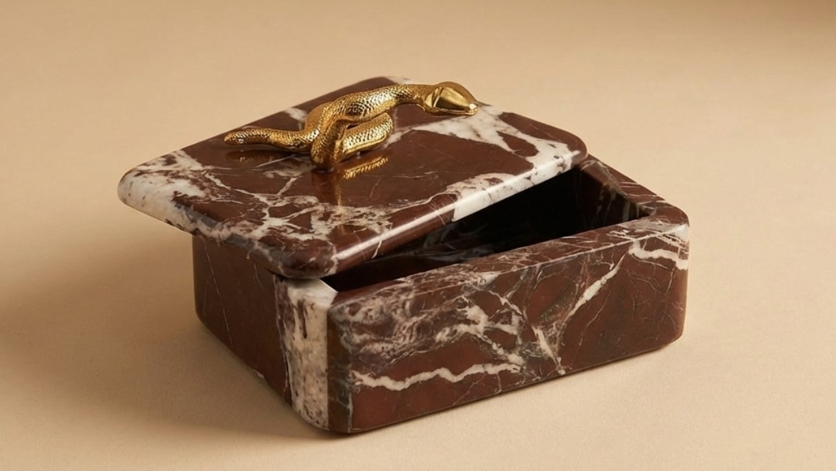 Leticia Red Box is a luxury decorative storage box crafted from rich red marble with a striking brass snake handle accent. Perfect for modern and artistic interiors, it adds bold elegance, functionality, and statement style to coffee tables, consoles, and premium home decor spaces.