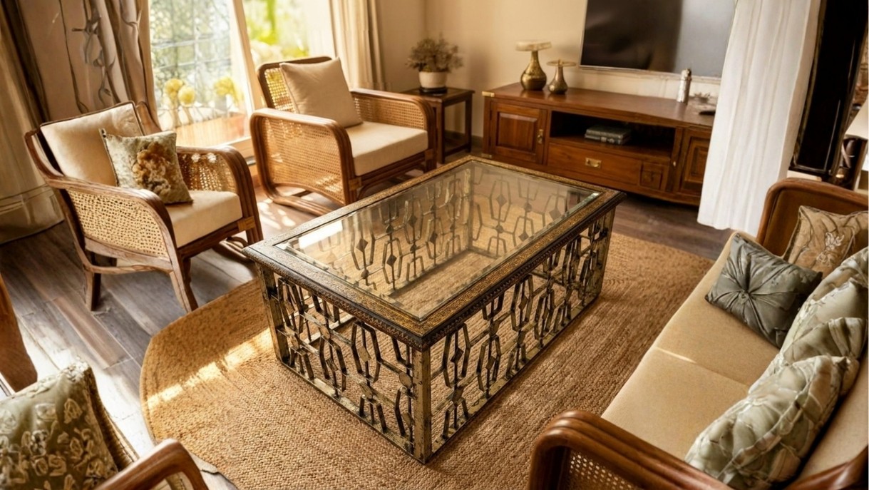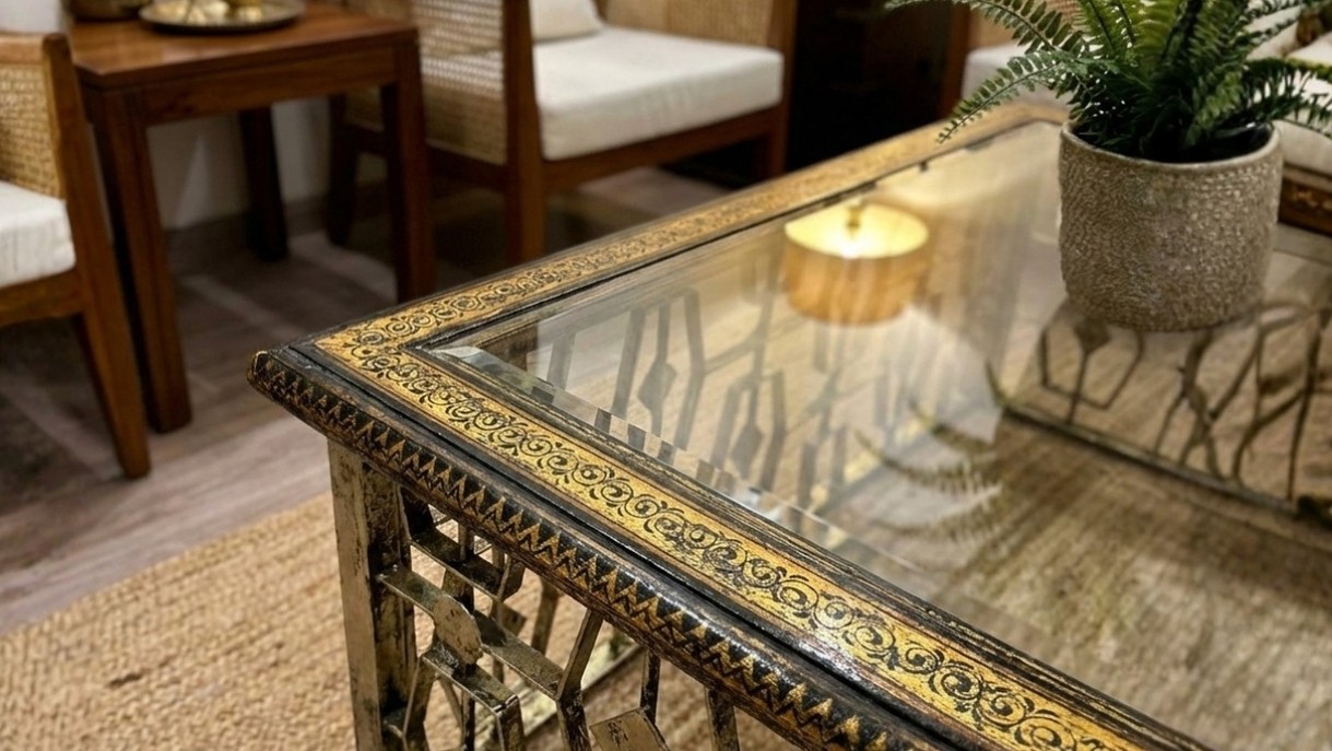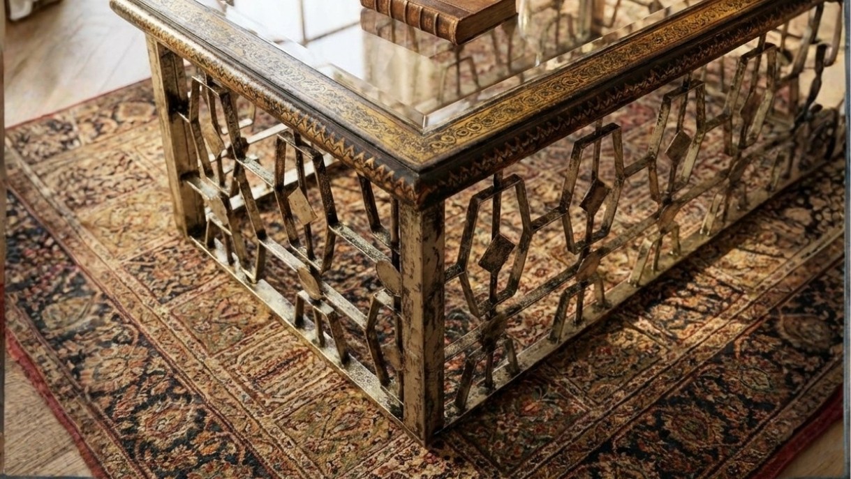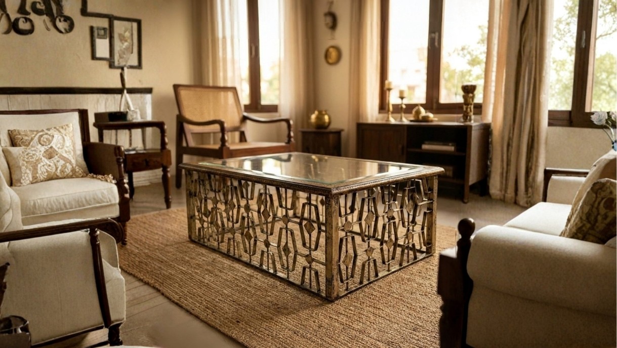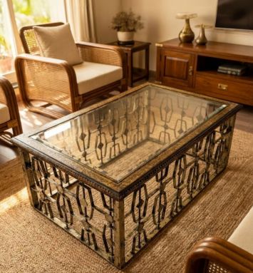 The Miraya Center Table blends contemporary style with artisanal charm. Designed with a hand finished metal base featuring an intricate geometric lattice framework, it is completed in a warm antique tone and paired beautifully with a sleek glass top, creating the perfect balance of strength and elegance.