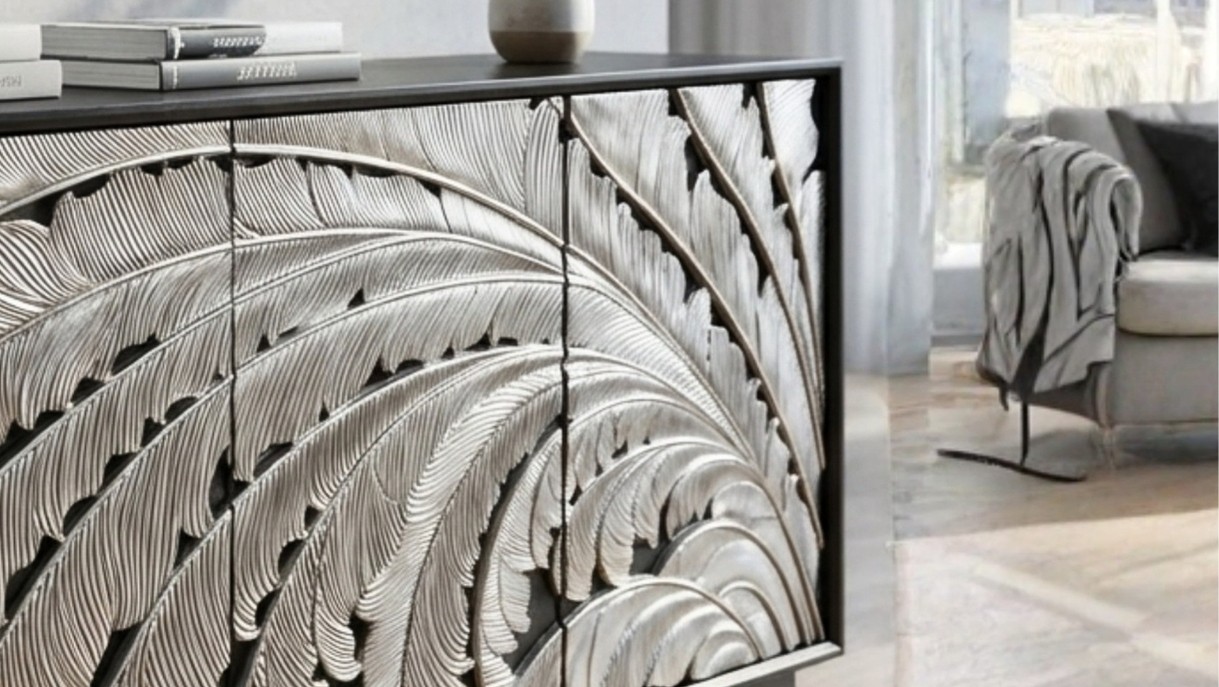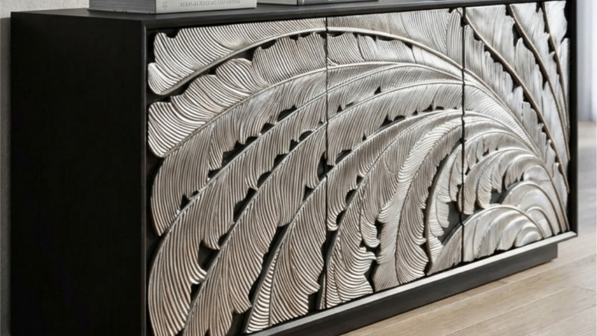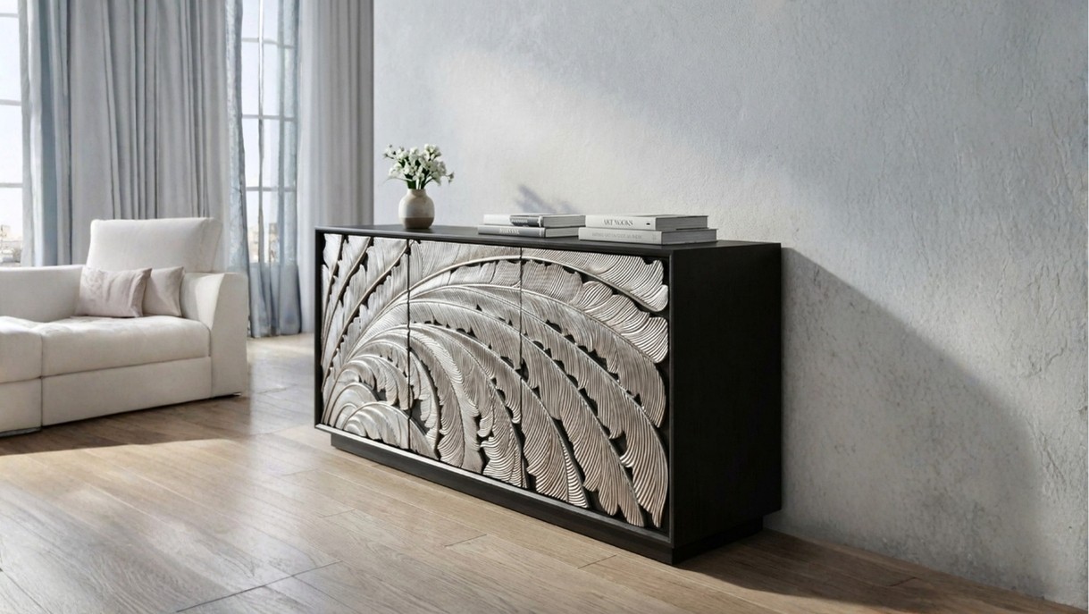 This statement console table features intricately carved panels with a flowing ombré pattern, creating depth and sculptural elegance. Framed in a sleek silhouette, it blends artisanal craftsmanship with contemporary luxury for refined interiors.