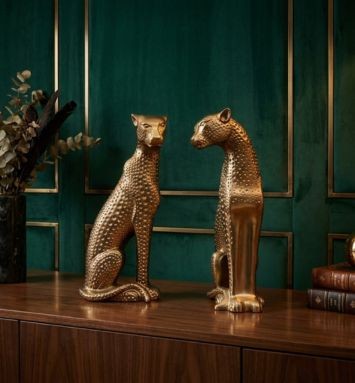A sculptural expression of power and elegance, this metallic panther duo is meticulously crafted to command attention and elevate refined interiors. Finished in a rich antique gold tone, it embodies timeless luxury and bold sophistication for statement styling.