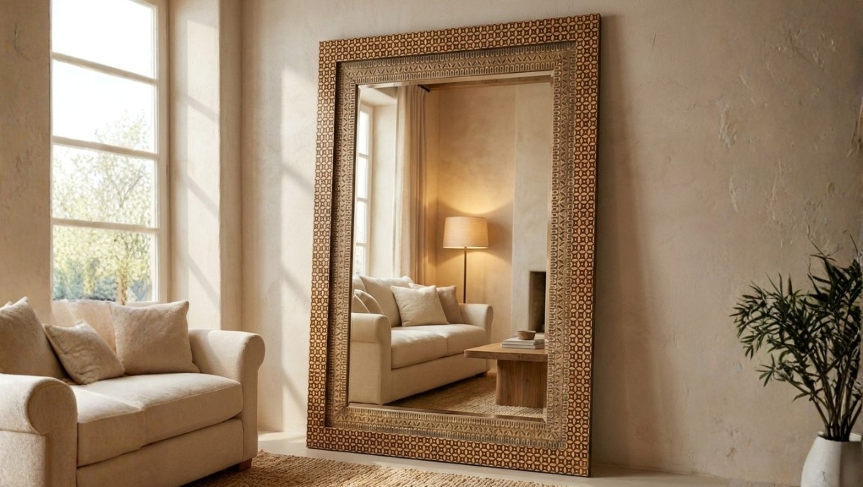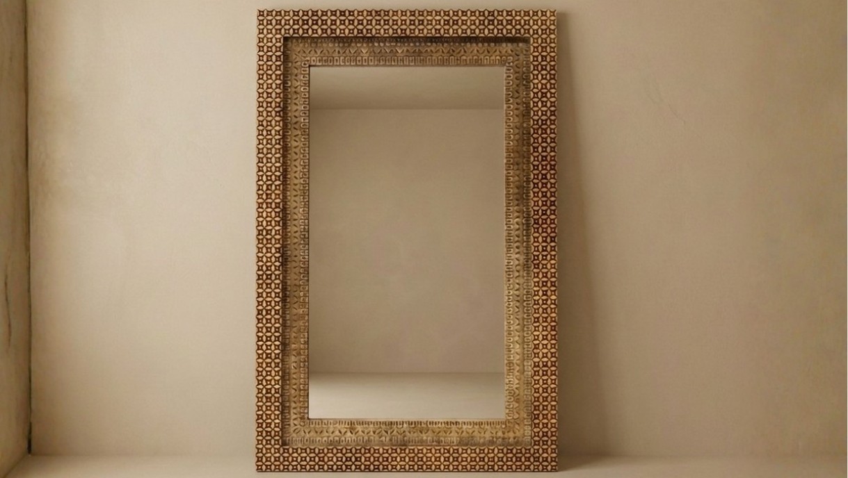 The Miraya Mirror showcases intricate hand-embossed detailing, blending artisanal craftsmanship with understated luxury. Its warm metallic frame adds depth, light, and timeless elegance to both contemporary and classic interiors.