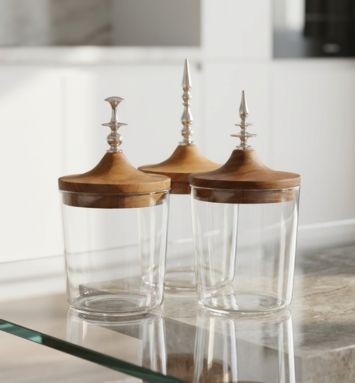 This refined set of glass jars features clear cylindrical forms paired with smooth wooden lids and elegant metallic finials. Designed to blend function with luxury, they add a polished, contemporary accent to kitchens, consoles, or styled surfaces.