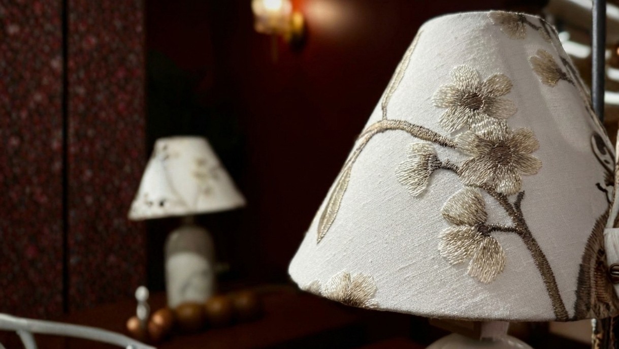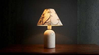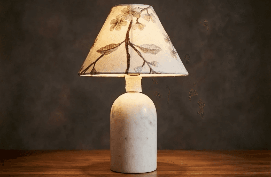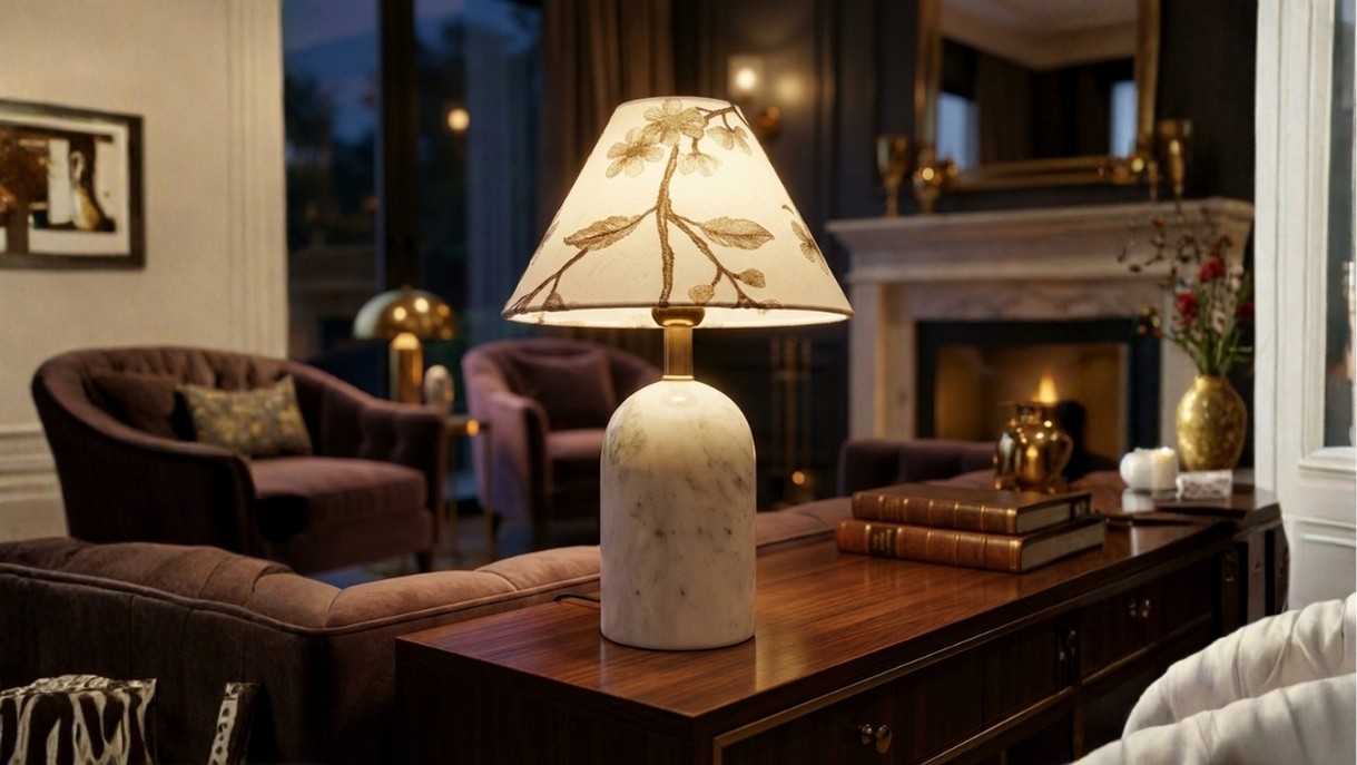This elegant table lamp features a smooth stone base paired with a delicately patterned fabric shade, casting a warm and inviting glow. Designed to balance natural textures with refined detailing, it adds understated sophistication to bedrooms and living spaces.